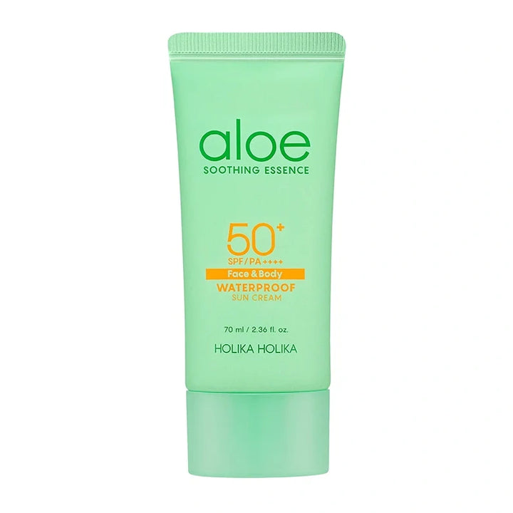 La Aloe Soothing Essence Waterproof Sun Cream de Holika Holika es un protector solar de amplio espectro con SPF50+ PA++++, ideal para rostro y cuerpo, que proporciona alta protección solar, resistencia al agua y efecto calmante e hidratante gracias a su contenido en aloe vera.