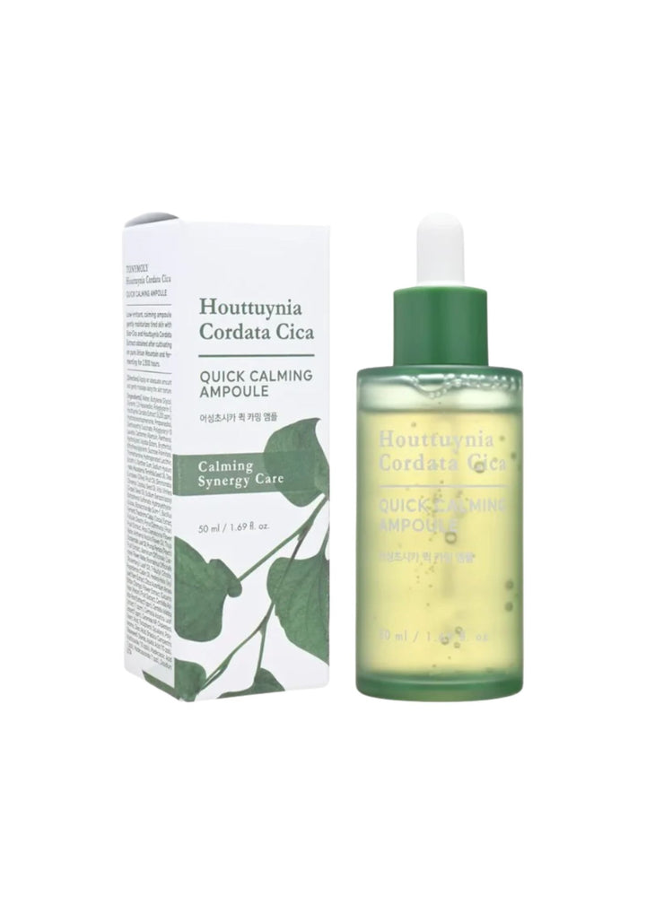 La Houttuynia Cordata Cica Quick Calming Ampoule de TONYMOLY es un suero concentrado formulado especialmente para calmar, regenerar y fortalecer la piel sensible, irritada o propensa a brotes. Con ingredientes naturales como la Houttuynia Cordata (planta del corazón) y el extracto de Cica (Centella Asiática), esta ampolla proporciona un alivio inmediato, restaurando la barrera cutánea y promoviendo una piel más saludable.