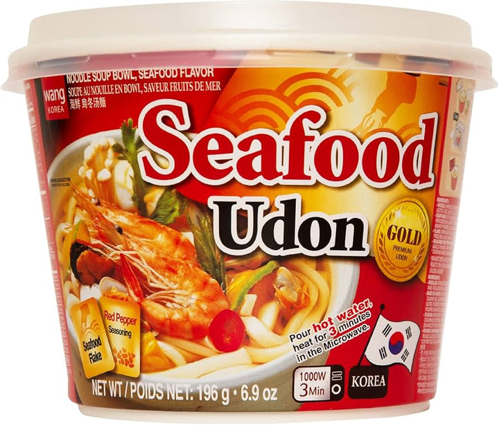 El Seafood Udon de WANG es una sopa instantánea de fideos udon gruesos y suaves, acompañados de un caldo con intenso sabor a mariscos. Incluye escamas de mariscos y condimento de chile rojo para un toque picante, ideal para quienes disfrutan de sabores marinos ricos y bien sazonados.